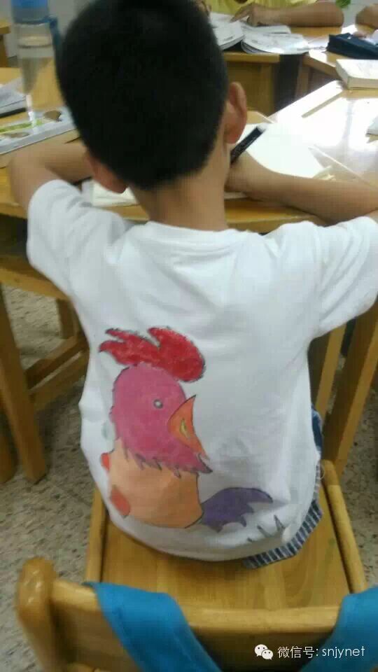 “老师,你看,一只大公鸡!”一个孩子拉着我去看。原来大公鸡是一个小帅哥衣服上的图案,一问得知,这只大公鸡还是他亲手画的,这画画得还真是不错呢!