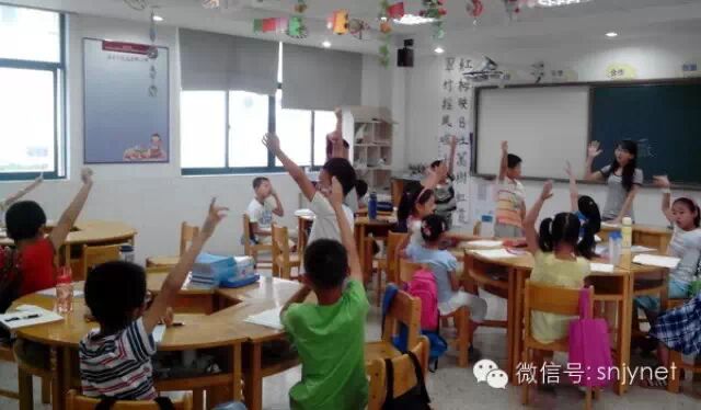 图为举手回答老师问题的小朋友们
