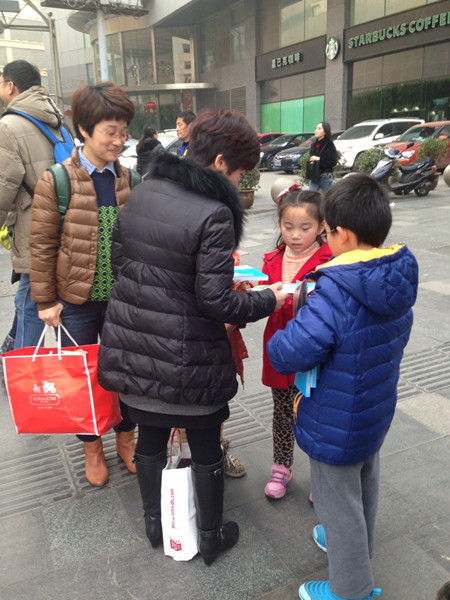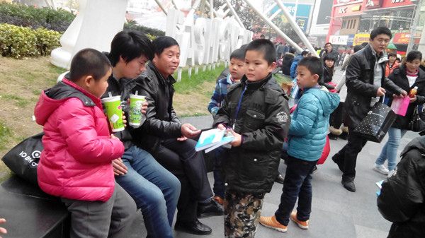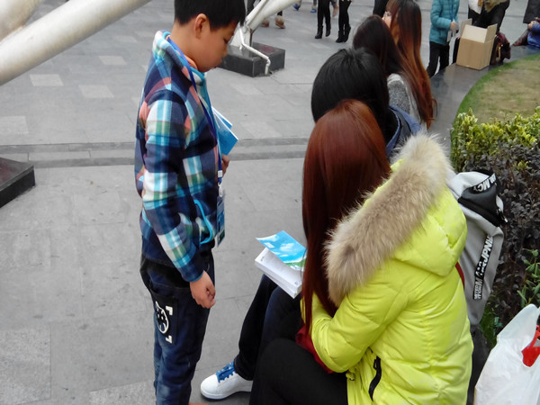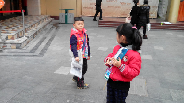 售书活动从两点钟正式开始,活动地点定在中央商场和新百之间的莱迪商场入口周围。因为是相对封闭的环形空间,能大大降低安全问题发生的概率。一点半之前,孩子们就已经到齐,聚集在广播电视大学的楼下了,大家特别期待活动开始,连最小的赏能小作家-“裸跑弟”何宜德(小名多多)也积极参与其中。在梅老师简单地列出了一些活动的注意事项后,孩子们迫不及待地抱着自己的作品来到了莱迪大门四周的小广场。
