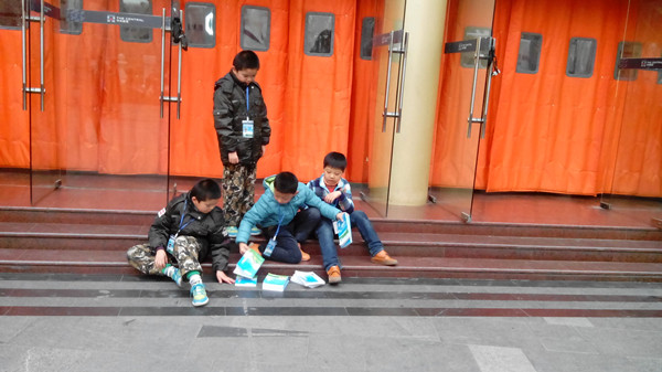 孩子们明显在售书过程中热情高涨,甚至有几个小作家在阶梯上摆起了“促销摊位”,边摆着书,还边“吆喝”着宣传自己的作品。